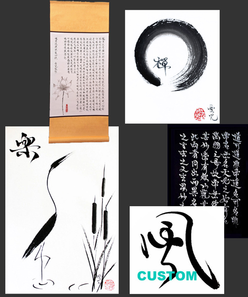 Custom: See the different types of custom calligraphy, custom painting or a combination of both that I offer. For other custom painting and calligraphy requests, please email me at info@oystudio.com or fill in the custom request form. Let me know what you have in mind, the size, colour (s), and I will get back to you as to the feasibility and cost. I would like to make it an interactive and satisfying experience for you.